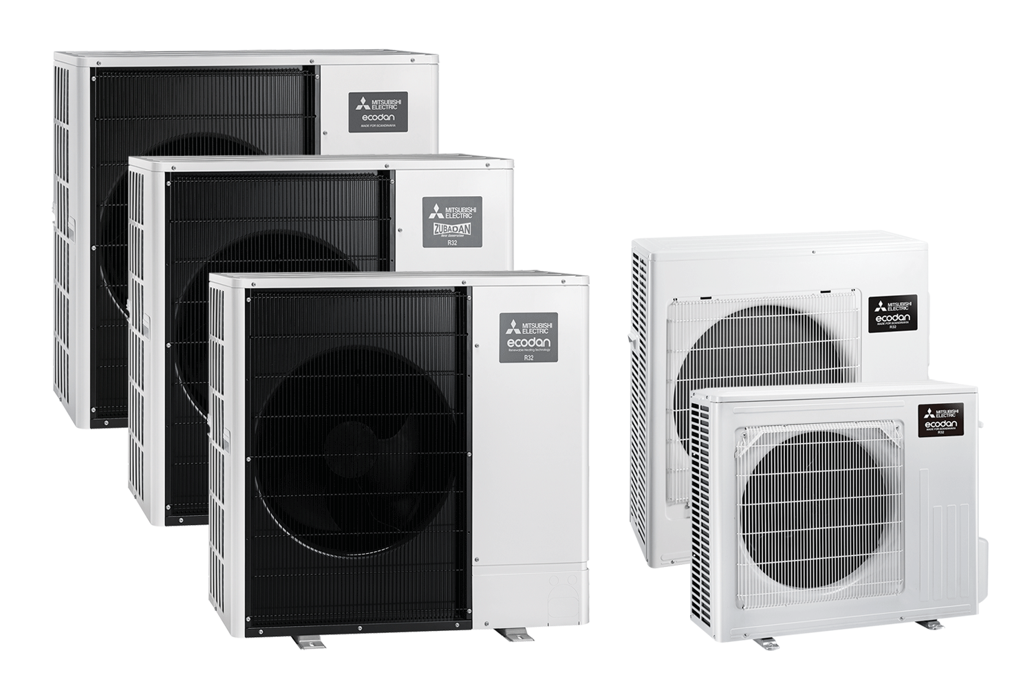 Utedelene er ekstremt stillegående og sorteres i 3 hovedgrupper: Hyper Heating Inverter, Power Inverter og Zubadan Inverter. Alle har trinnløs inverterteknologi som kostnadseffektivt regulerer motorhastigheten etter behov. Når det er kaldt ute er det viktig med stabil og effektiv avriming av utedelen. Alle utedelen i Ecodan-serien er for nordiske forhold og leveres med behovsstyrt varme i bunnpannen for effektiv avriming. Standard spenning er 230V, og de fleste leveres også som 400V.